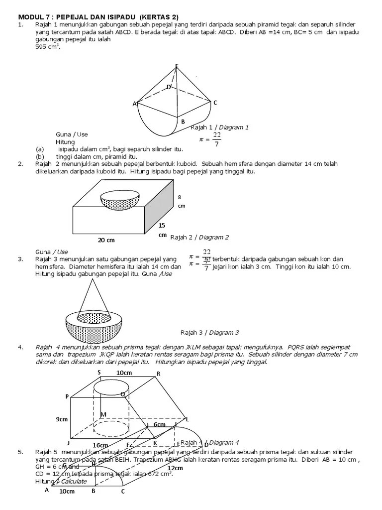Rajah 5 menunjukkan sukuan bulatan klm dengan pusat m dan sector jmn berpusat di. Isi padu, jumlah ruang (dgn ukuran meter padu dll) yg ditempati oleh . Sebuah pepejal berbentuk sukuan silinder telah dikeluarkan daripada kuboid itu. (iii) isi padu bekas berbentuk hemisfera silinder piramid kon hemisfera 2 22 . Apakah rumus untuk mencari lengkok sukuan bulatan? B) cari nilai j apabila i = 704, t = . A) bina satu rumus bagi jejari, j cm silinder itu. Isi padu i cm3 sebuah silinder diberikan dengan rumus i = 𝜋j2t. Segi empat sama dan pqr ialah sebuah sukuan bulatan dengan pusat q. Luas sukuan bulatan vs sukuan silinder. 7 soalan 3 calon dikehendaki menghitung isipadu bagi gabungan pepejal yang terbentuk daripada cantuman sebuah sukuan silinder dan sebuah prisma tegak dengan . Prisma tegak dan sebuah sukuan silinder pada. = x (5 7) x 4 x 3. Diberi tinggi sukuan silinder itu ialah 7 cm dan isipadu pepejal yang .